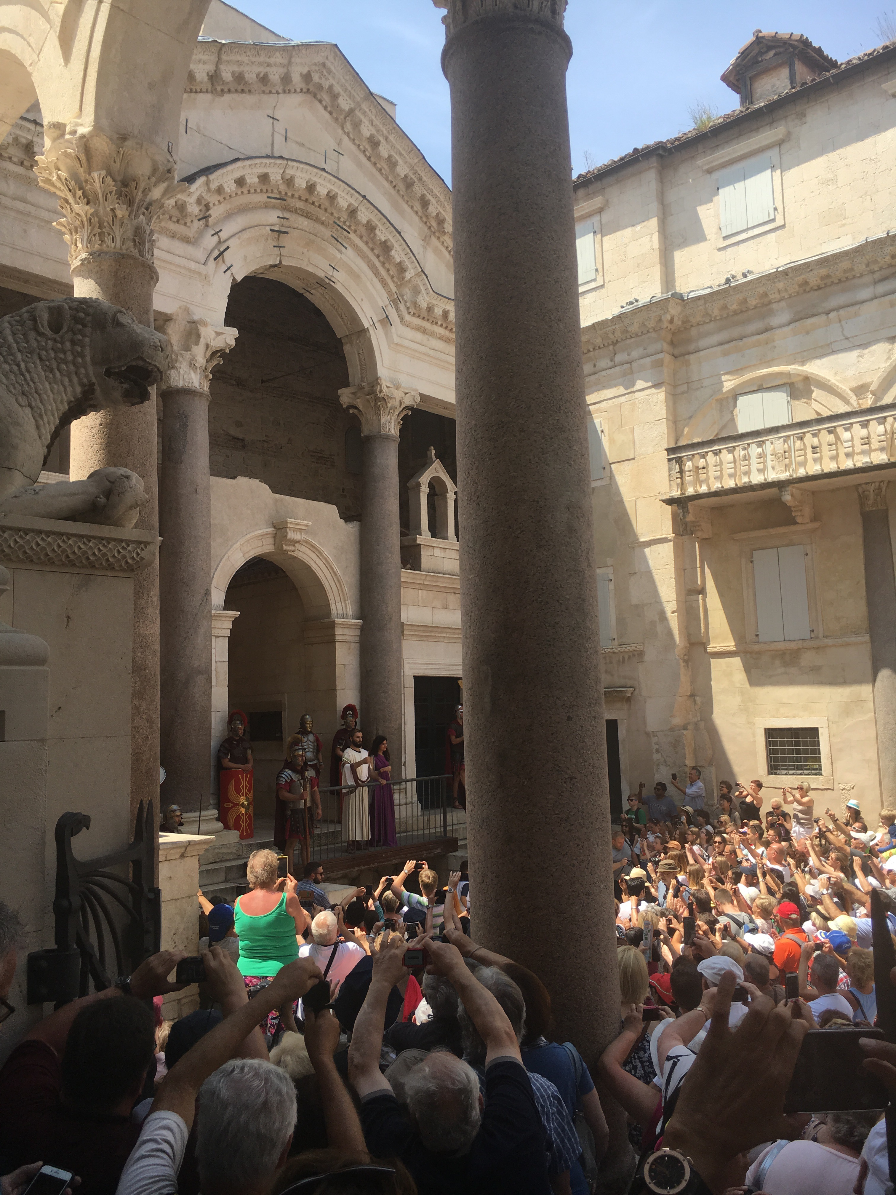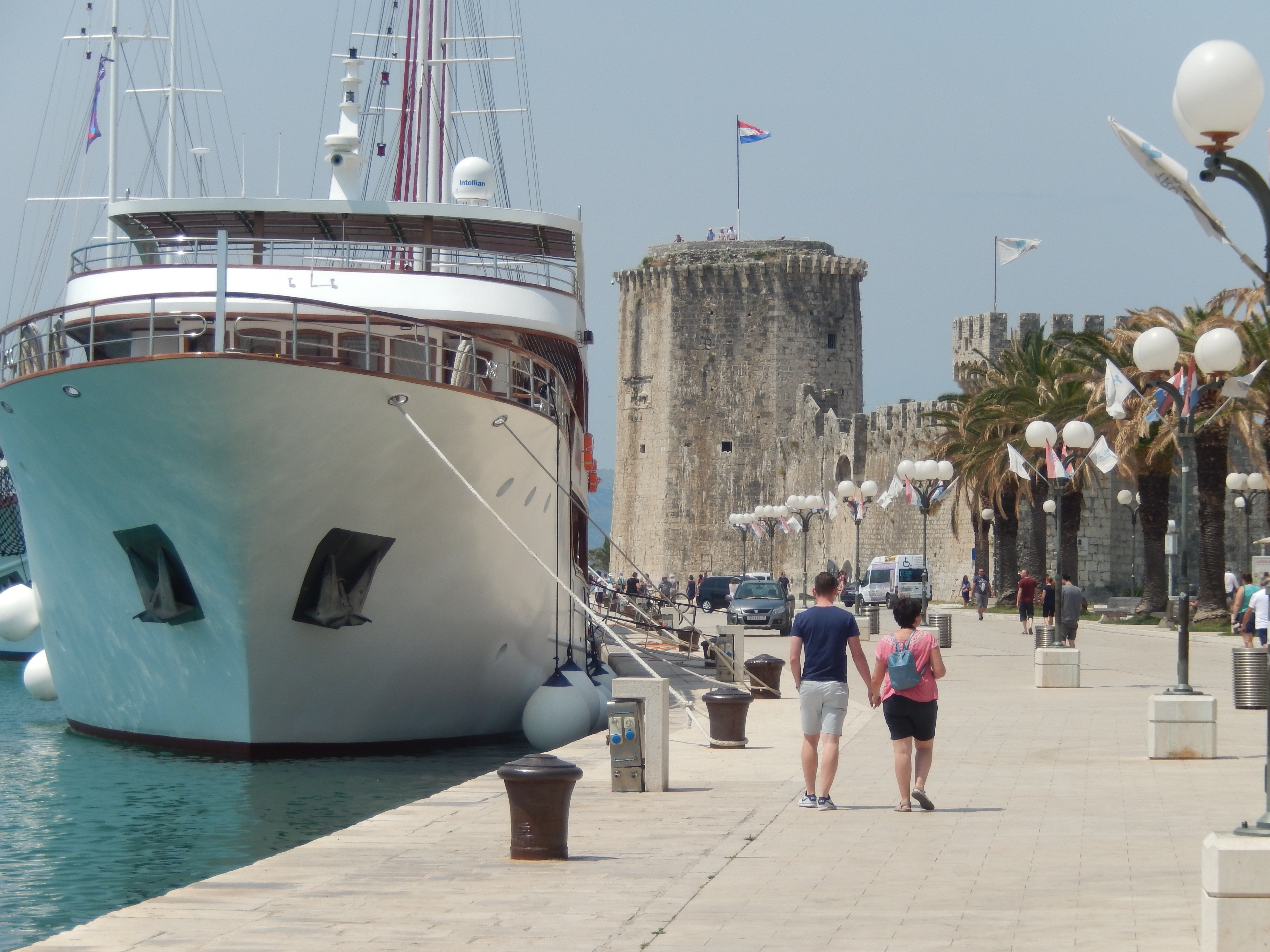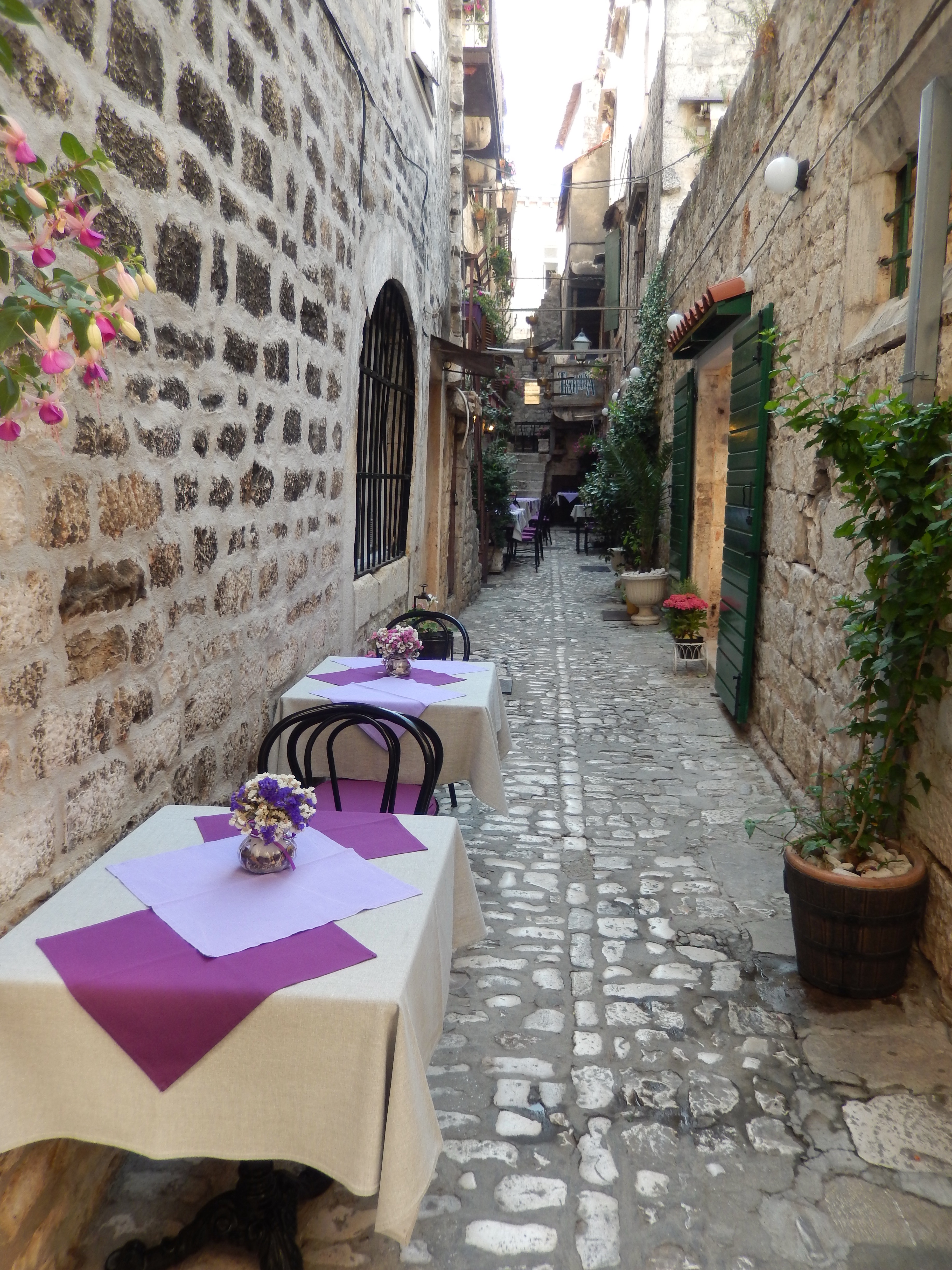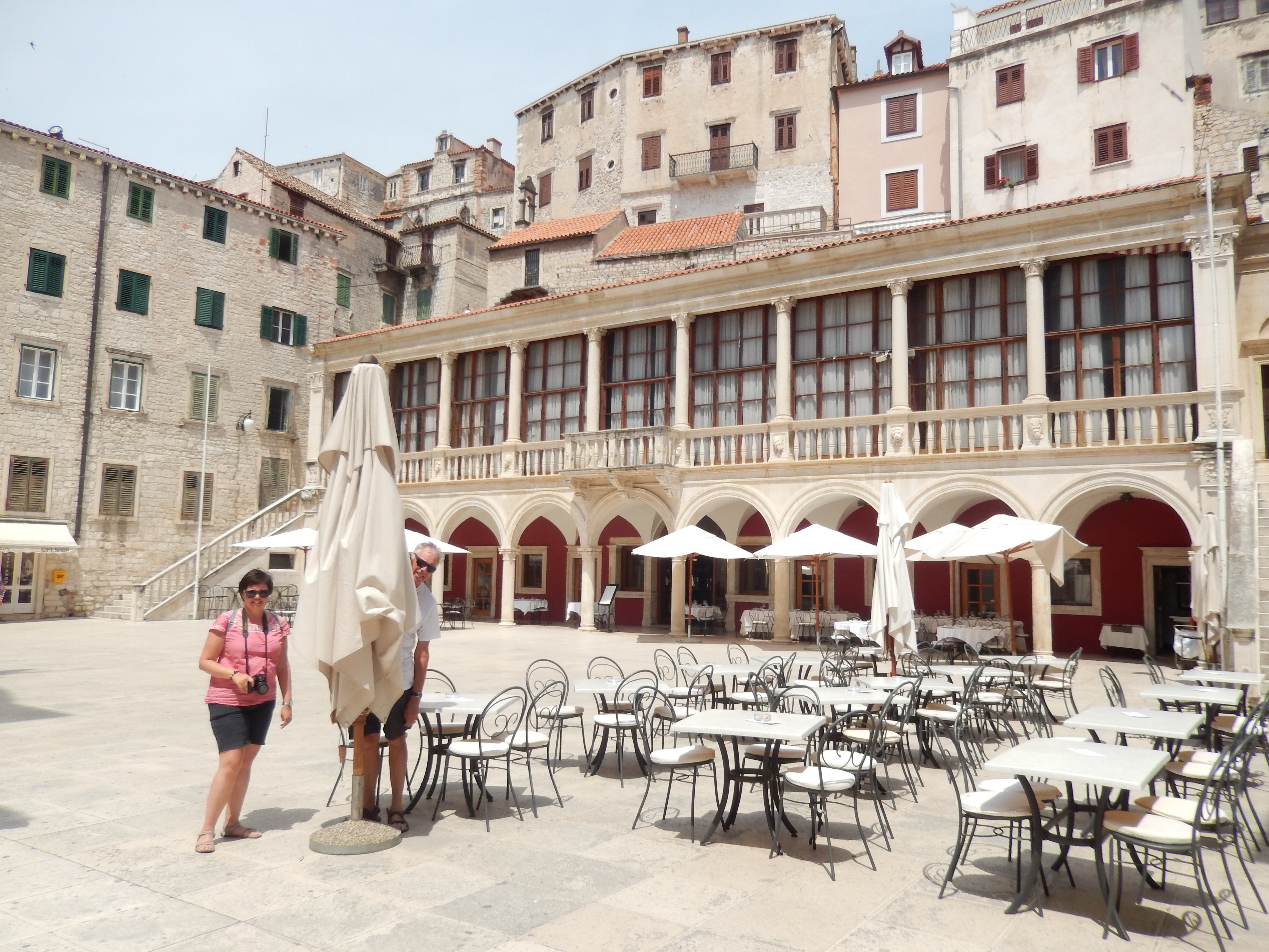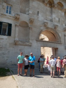 Morning ‘moffees’ were at Trogir. Trogir is a town on the central coast of Croatia between Split and Zadar. Its a preserved old town, known for its mix of Renaissance, baroque and Romanesque buildings. It lies on a small island connected to the mainland and the island of Čiovo by bridges. Parts of the medieval city remain. We zig-zagged through the island’s network of laneways and there was another bell tower to climb for Mr P and Ms C. A performance from Roman times was re-enacted in the main square much to the tourists’ delight. Don’t ask Ms X which town she was in as she has a habit of referring to it as Trilby.
