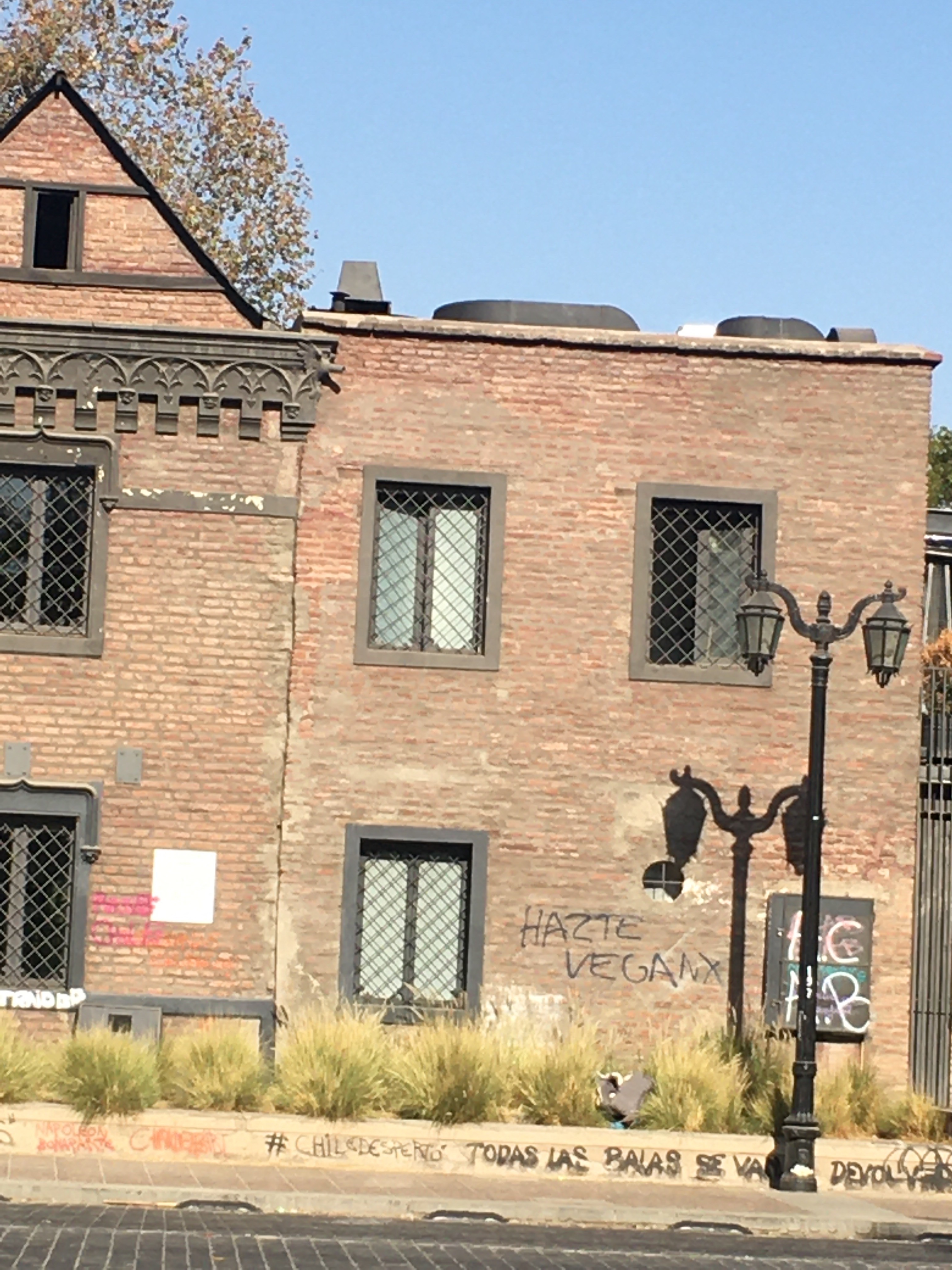 In November of 2019, this city was devastated by dissidents who took to the streets to protest. Our retirees have been known to protest whilst marching from Trades Hall chanting in their red T-shirt’s however these Santiago protests involved burning 34 metro stations, destroying supermarkets, smashing traffic signals and a lotta graffiti. The protests still happen but now each Friday twilight. So very thoughtful however Mr and Ms X found themselves in the middle of an impromptu one when 30 young people racing on foot charged past them as 2 police RIOT buses and 2 police support vehicles turned up. One protester got some rocks and started throwing them at the vehicle. The Chilean-SWAT team, about 20 in each bus then got out. The impromptu event soon fizzled. There’s many public buildings and monuments that are right in the centre of the city that are covered with graffiti and messages. They seem to be anti- everything including vegans!