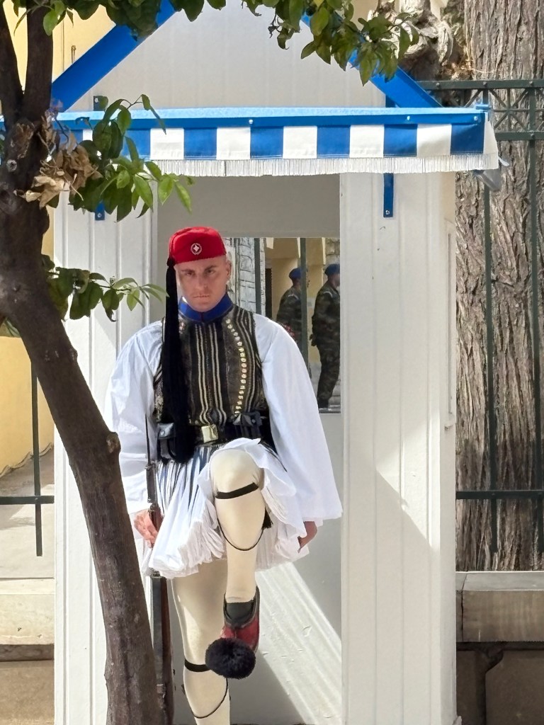 They decided to head to the heart of Athens and watch the weekly changing of the guard that happens on Sundays at 11am. Now you would think that most Greeks had already seen this and there would be good spots available for tourists. Nope but thank goodness Mr X has long arms so he could get a shot and then show Ms X later.
