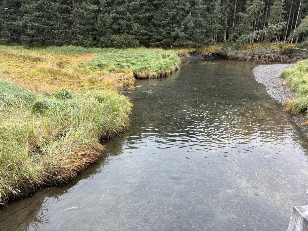 All this flattened grass is evidence of bear activity and there was plenty of salmon, but…